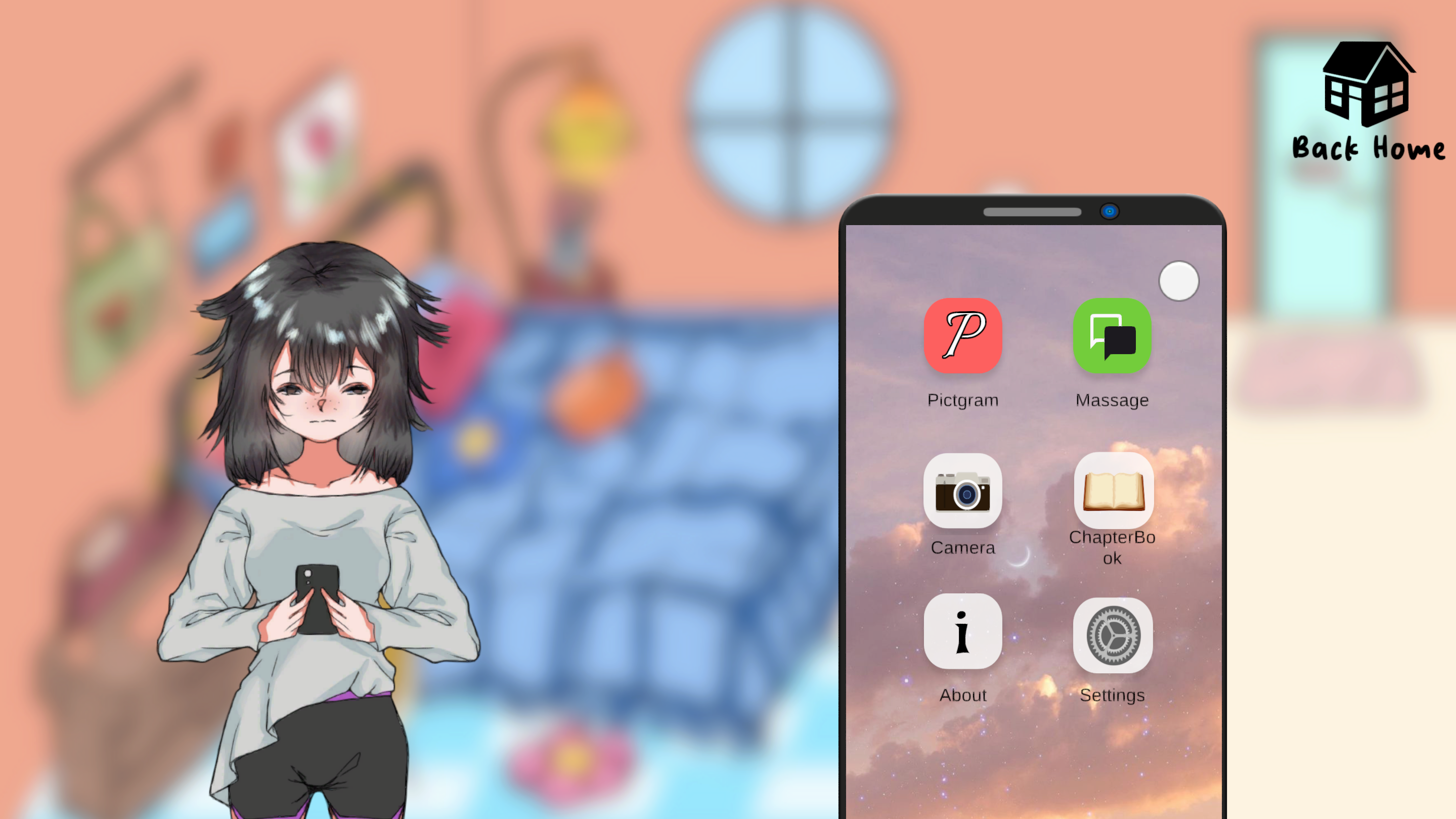 - Phone Interactions (white circle in the upper right corner → to exit the application, receive and send message → Message, post photo → Social Media PictGram, take photo → Camera).
