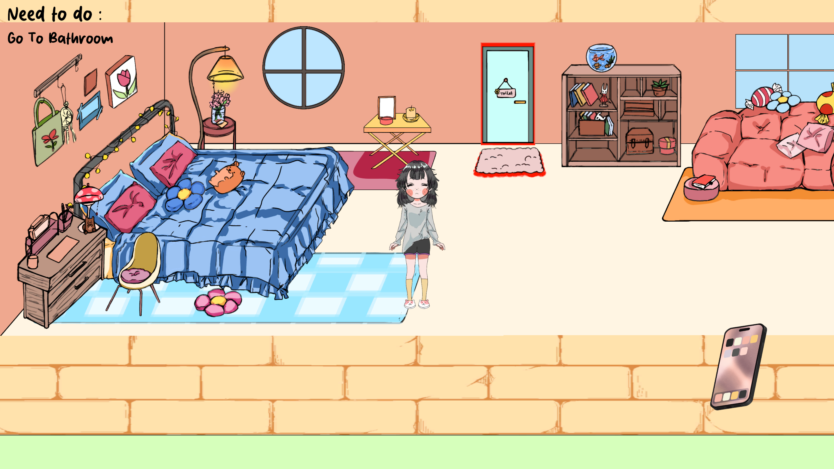 - Daily Activities Mini-Games (toothbrush mini game → go to the bathroom (blue door), buy food → go outside (brown door), do make up, change days → go to bed).
